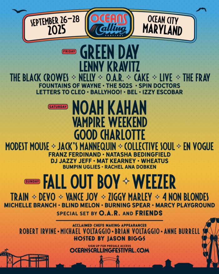 Oceans Calling Festival has revealed its impending artist lineup. The annual event will return to Ocean City Inlet Beach in Ocean City, Md., from September 26-28, 2025. This year’s roster of musicians includes more than 40 names and is led by headliners Green Day (Friday, Sept. 26), Noah Kahan (Saturday, Sept. 27), and Fall Out […]
