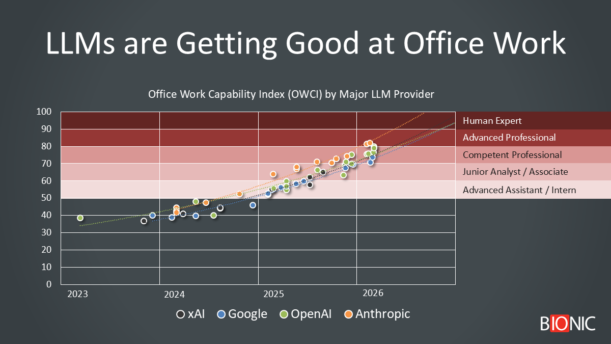 Introducing the Office Work Capability Index (OWCI) and what it suggests about when AI may match or surpass humans on office work at advertising agencies.