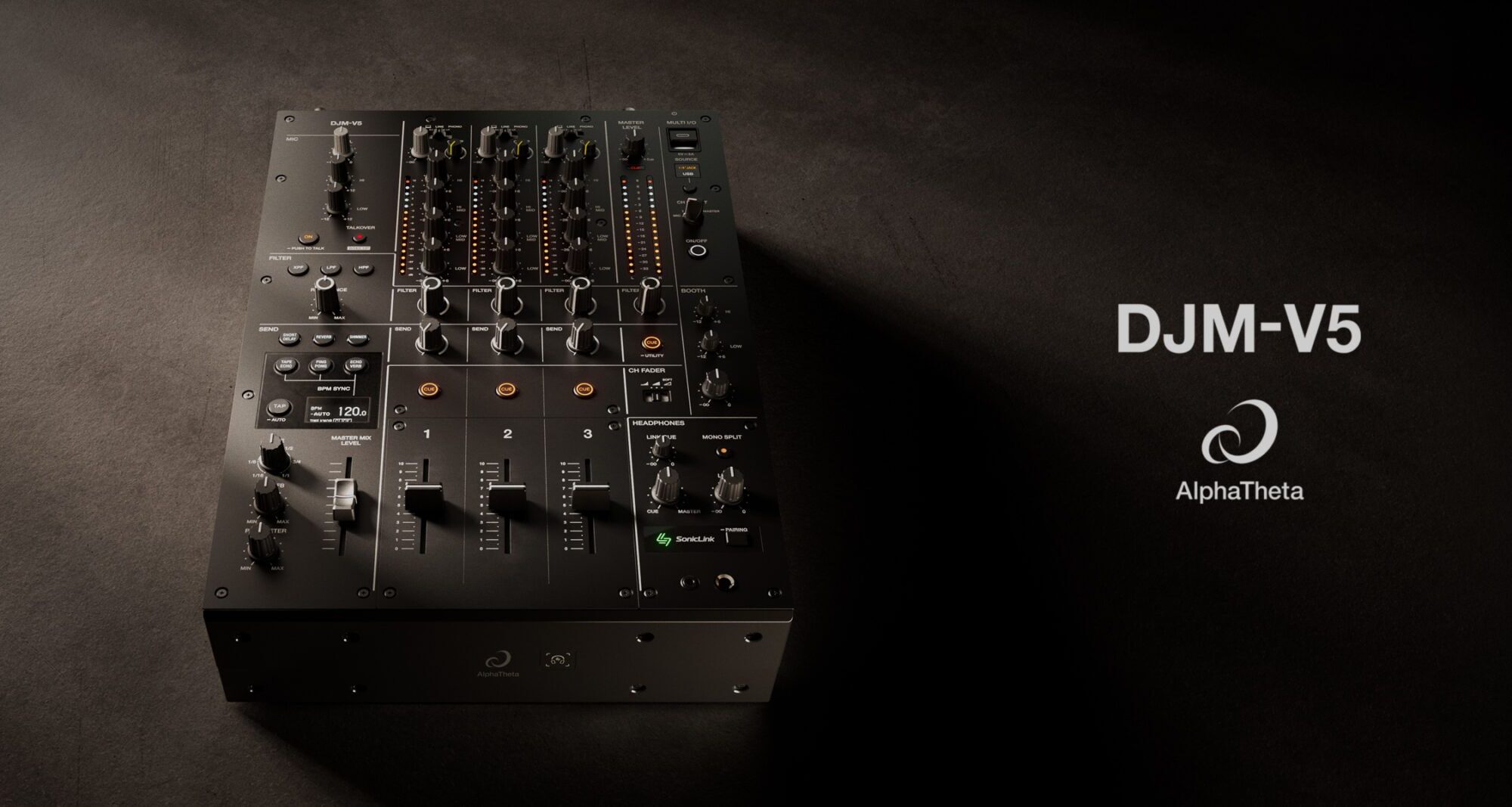 The DJM-V5 mixer: 3 channels, V10 Sound, 4-Band EQ, Send FX – no Beat FX or crossfader.