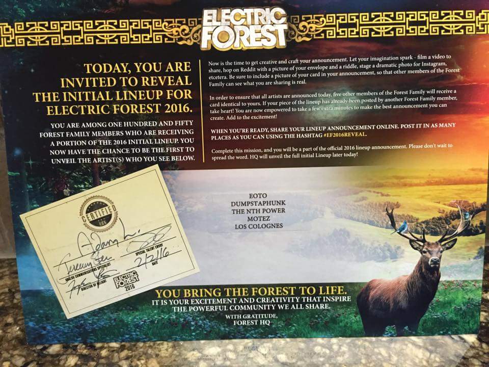 Electric Forest, everyone’s favorite music festival in Sherwood forest, decided to do something special to unveil its 2016’s lineup. Sending #EF2016Reveal envelopes to some of its attendees, Insomniac decided to release the lineup through a collective work of its forest family.
