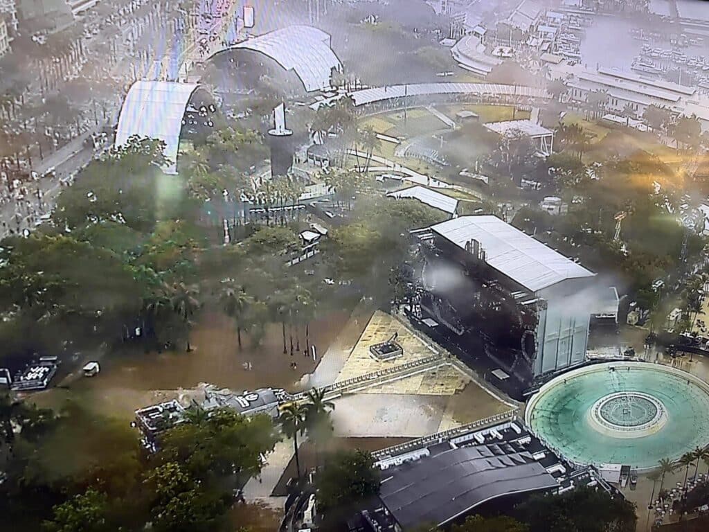 A large puddle near the Ultra Music Festival Mainstage forced organizers to briefly pause its programming.